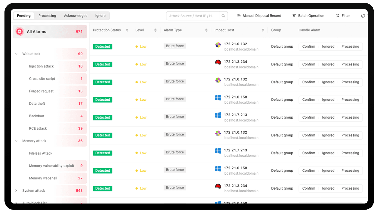 اكتشاف الأبواب الخلفية على الويب: يدمج محرك Yara الخاص ومحركات اكتشاف الأبواب الخلفية التابعة لجهات خارجية، مما يتيح التعرف الفعال على ملفات webshell الخلفية في الأدلة الويب.